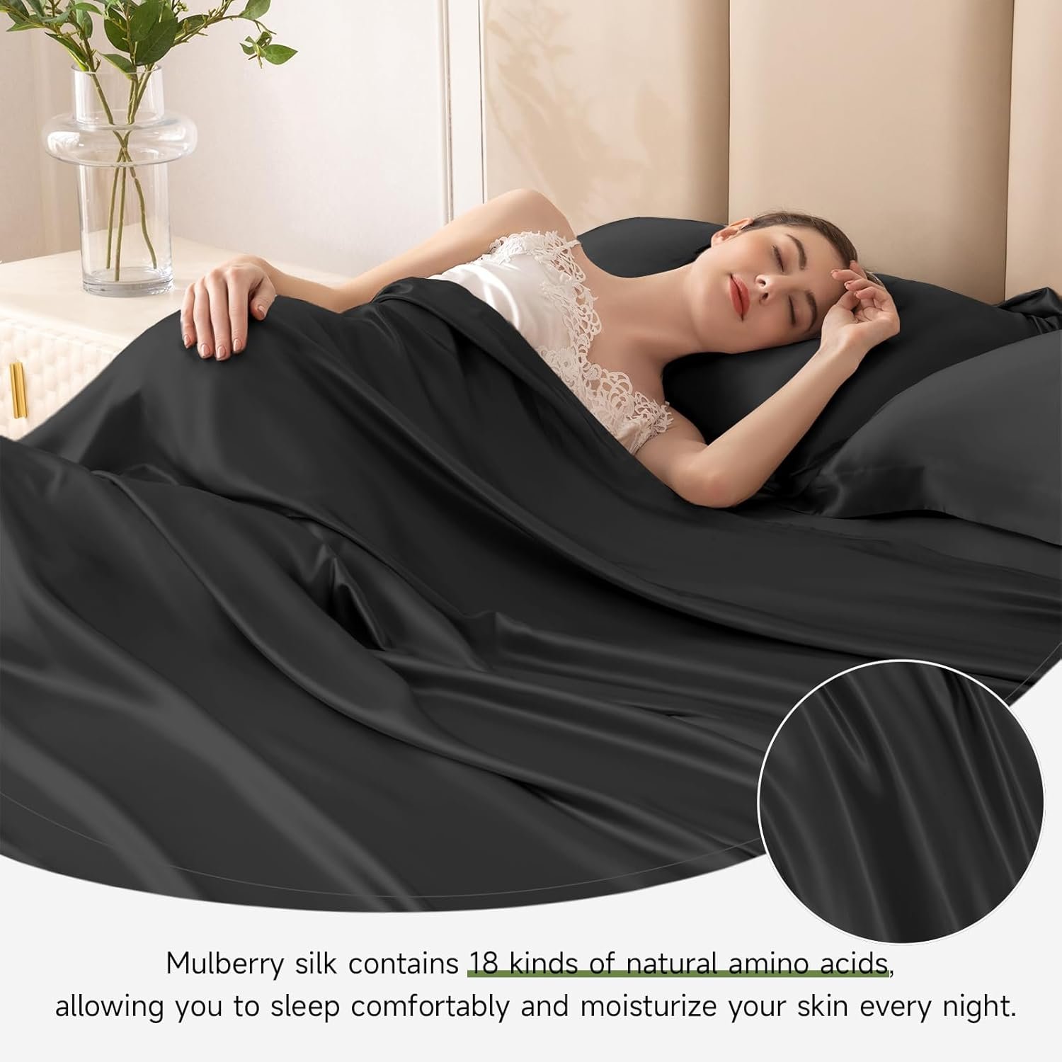 The set includes a flat sheet, a fitted sheet with deep pockets for a secure fit on King mattresses, and two matching pillow shams, delivering a complete, coordinated look for your bedroom. Silk naturally regulates temperature, keeping you cool in summer and cozy in cooler months, making it ideal for year-round comfort.