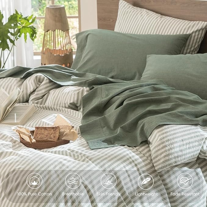 Crafted from breathable cotton, this sheet set helps regulate temperature, keeping you cool in summer and comfortable in cooler months. The heathered green shade adds a calm, earthy tone that blends beautifully with modern, minimalist, or natural-style interiors.